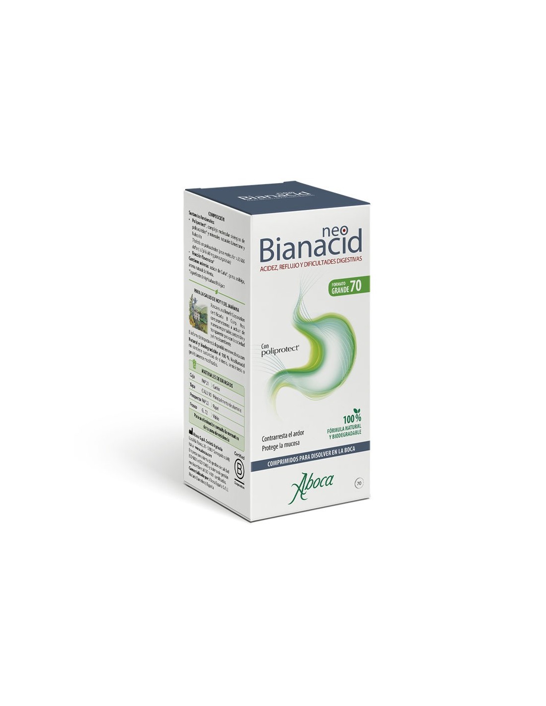 Aboca Neobianacid 70 comprimidos para disolver en la boca. Es un producto a base de complejos moleculares vegetales y minerales que forma sobre la mucosa una película protectora de efecto barrera, que protege el estomago del contacto de los jugos gástricos y las sustancias irritantes.
